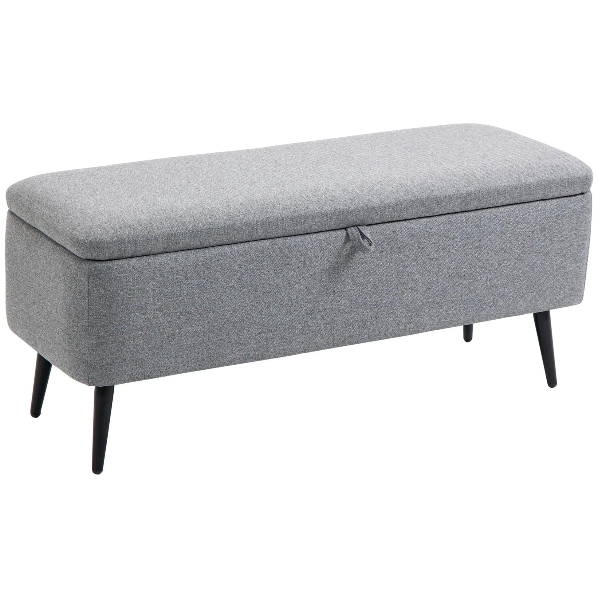 Habillé d'un tissu polyester respirant à l'effet lin, ce banc coffre offre une texture douce et un rendu visuel épuré. Ses pieds coniques en acier apportent une touche moderne et stable à l'ensemble.