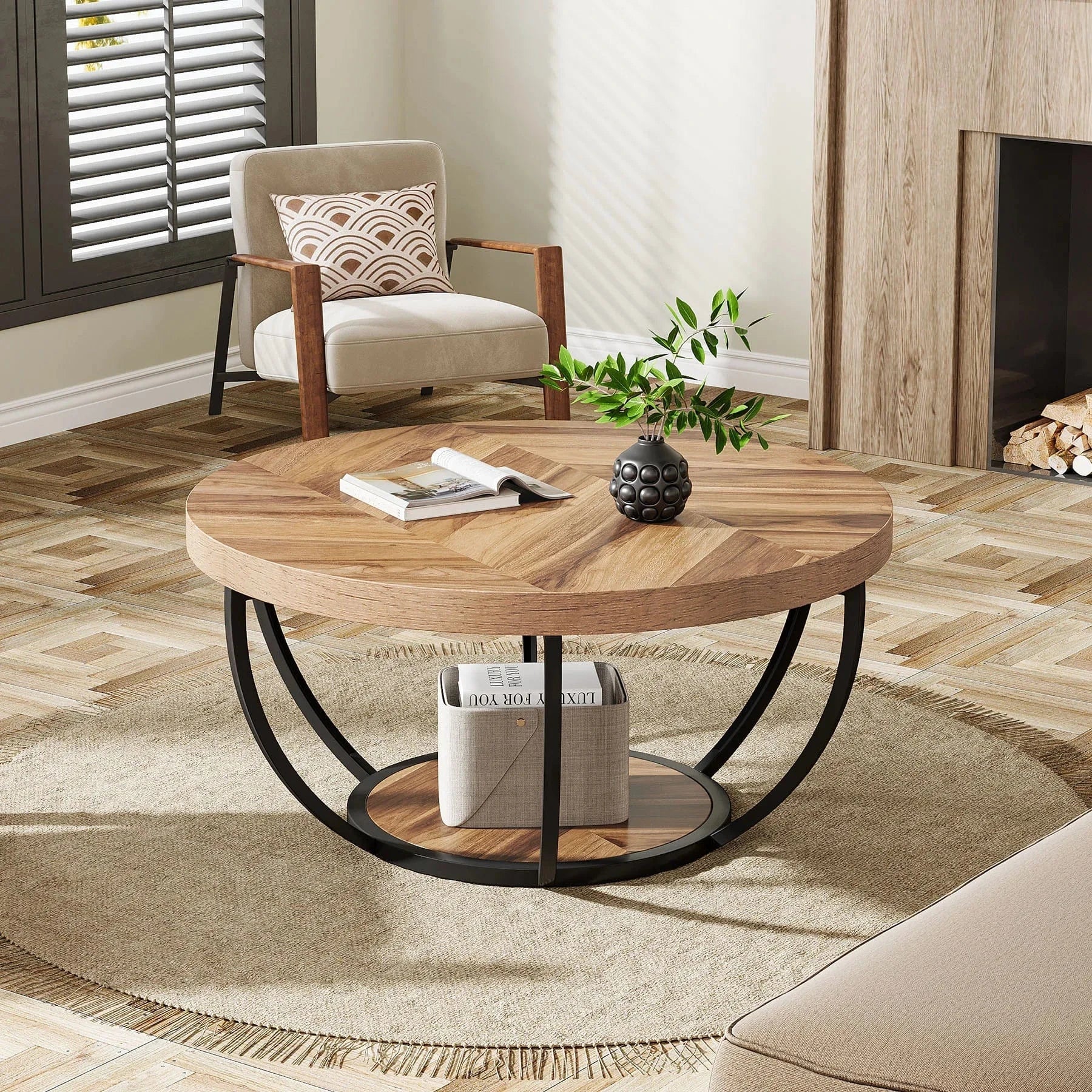 Découvrez une table basse au style antique, conçue en panneau de particules bois E1 (résistant aux hautes températures, imperméable et anti-rayures) et soutenue par une base en métal noir. Assemblée facilement, elle offre un plateau spacieux de 80,52 cm de diamètre avec rangement inférieur intégré.Grand espace de rangement