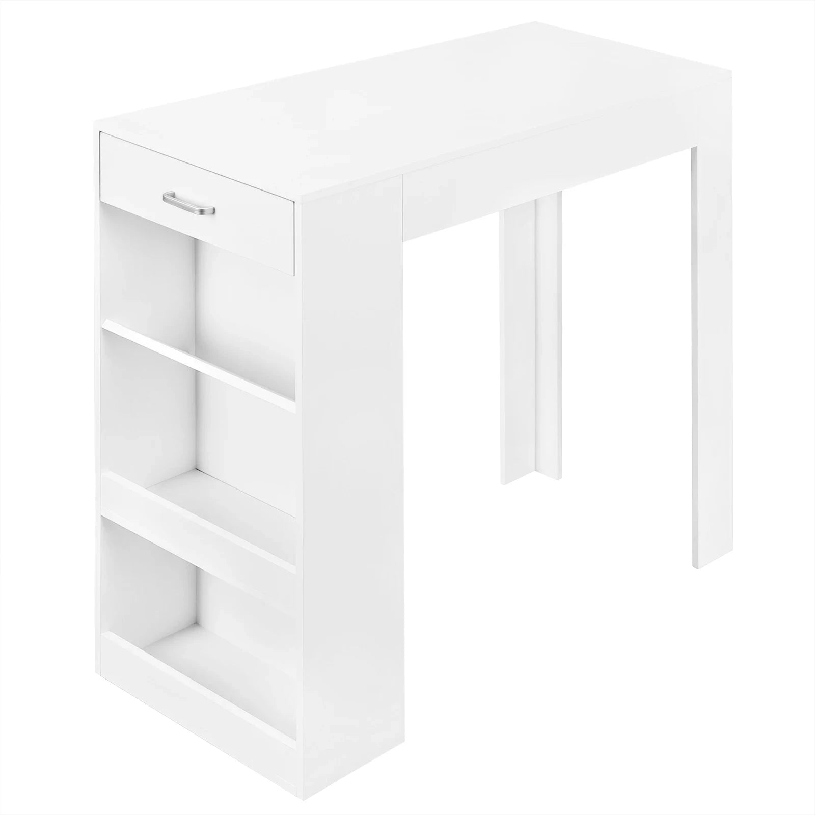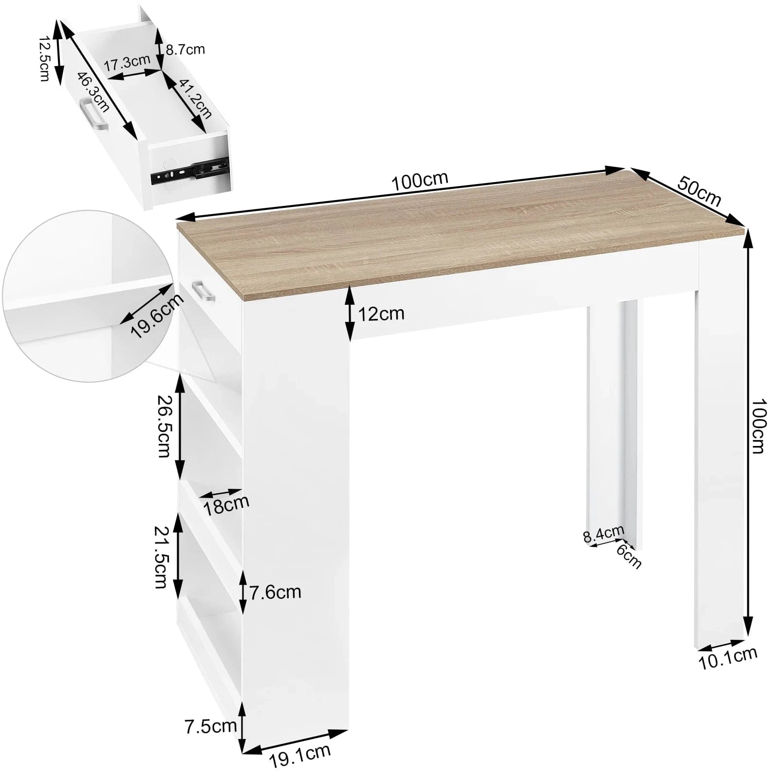 La table haute intègre une étagère multifonctionnelle comprenant un tiroir, un casier à vin incliné et deux tablettes, vous permettant de conserver verres, bouteilles et ustensiles à portée de main tout en optimisant l’espace.