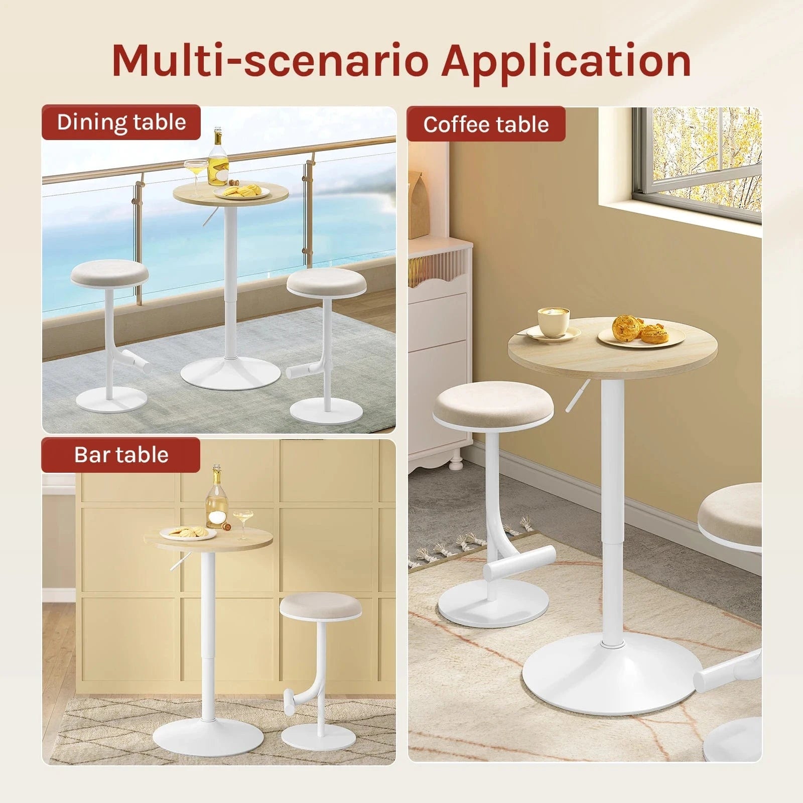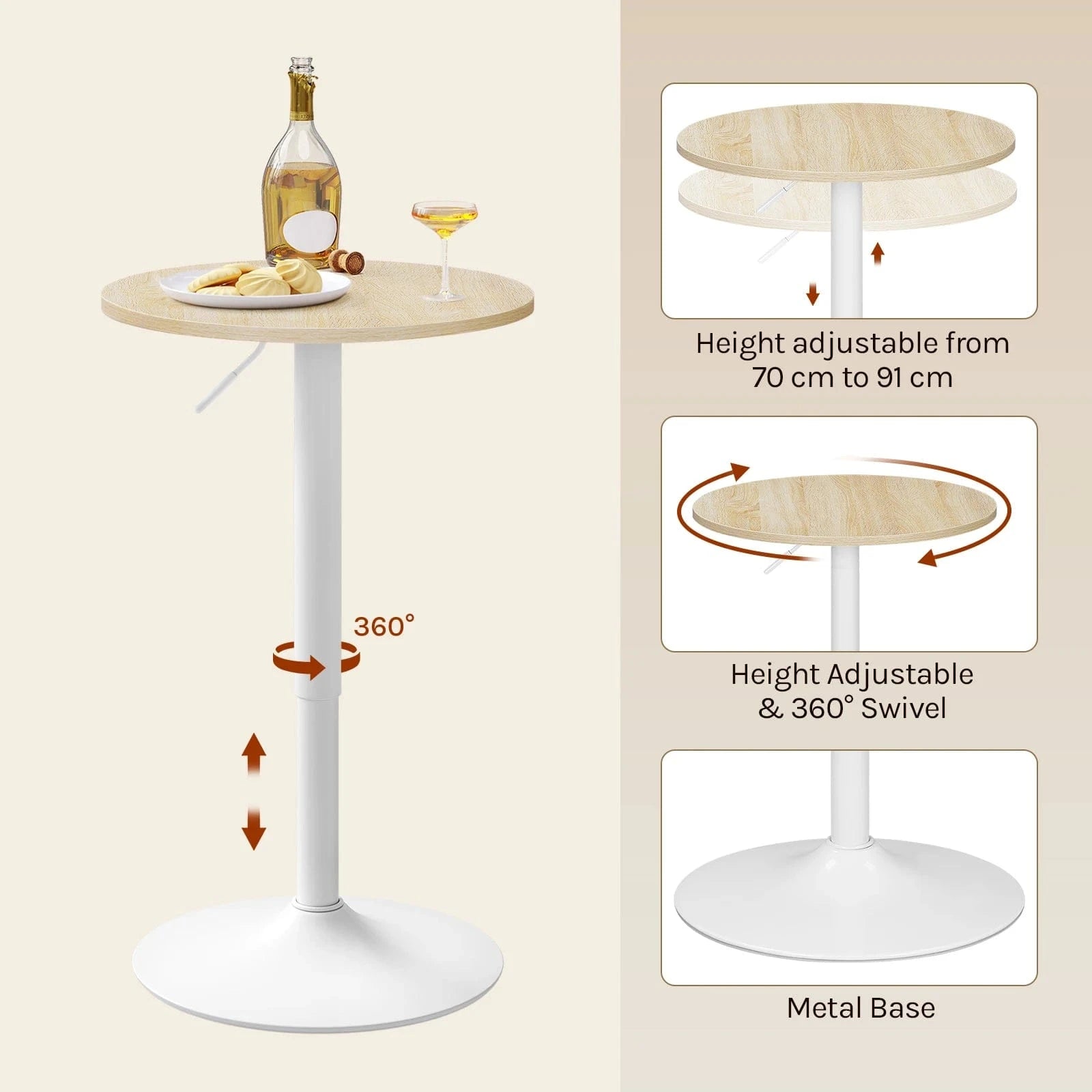 Grâce au vérin à gaz, la hauteur est réglable de 69,5 à 91,5 cm pour s’adapter à tous les utilisateurs et situations. Le plateau rotatif facilite le service ou la consultation de documents lors d’événements ou de réunions.